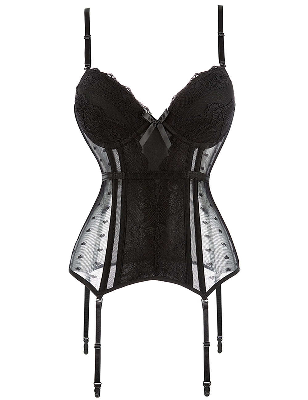 The cup edges are trimmed with pleated mesh fabric, adding playful and cute details that soften the bold corset look. Adjustable garter straps securely hold stockings in place, making this piece versatile for different occasions. Adjustable shoulder straps further enhance comfort and fit flexibility. Designed with inclusivity in mind, this corset is available in extended sizes, ensuring confident wear for curvier figures as well.
